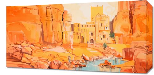 Obraz z serii abstrakcja zatytułowany Ruiny pod Słońcem. Ta ilustracja przedstawia scenę z antycznymi ruinami w ciepłej, pastelowej palecie kolorów, która oddaje odczucie spiekoty i światła słonecznego. Zarysy starożytnej architektury wyrastają z pustynnego krajobrazu, nadając scenerii poczucie wieczności i historii. Odbicie wody i subtelne sylwetki postaci w tle wprowadzają ludzki wymiar do tej scenerii, sugerując trwającą obecność i ciągłość cywilizacji. Obraz ten idealnie wprowadzi do każdego wnętrza element przygody i odkryć, inspirowany podróżami i historią, idealny dla przestrzeni publicznych, biur podróży, a także jako dekoracja w domach miłośników historii.