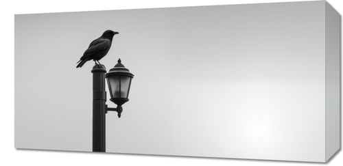 Obraz z serii wnętrza zatytułowany Samotny Postój Kruka. Prezentuje on sylwetkę kruka spoczywającego na klasycznej latarni ulicznej, uchwyconą w monochromatycznej palecie szarości. Ten spokojny, lecz sugestywny obraz jest symbolem refleksji i tajemnicy, doskonale wpisując się w klimat współczesnych przestrzeni miejskich. Praca ta z pewnością stanie się wyrazistym dodatkiem do nowoczesnych wnętrz, takich jak lofty czy minimalistyczne salony, a także wniesie element zastanowienia do przestrzeni publicznych takich jak galerie, kawiarnie i biblioteki, gdzie odosobnienie miesza się z miejskim zgiełkiem.