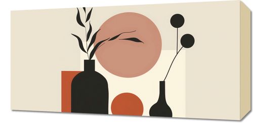 Obraz z serii boho zatytułowany Stół Roślin. Plakat przedstawia stilizowaną kompozycję abstrakcyjnych form, które mogą przypominać wazony z roślinami. Czarny, silnie zarysowany wazon po lewej stronie kontrastuje z bardziej płynnymi kształtami i ciepłymi odcieniami czerwieni i beżu, tworząc zrównoważoną, ale dynamiczną scenę. Rośliny są zredukowane do najprostszych form, co nadaje im elegancki, graficzny charakter. Prostota linii i ograniczenie detali podkreślają minimalistyczny charakter pracy. Świetnie sprawdzi się jako dekoracja w nowoczesnych, minimalistycznych przestrzeniach, gdzie może służyć jako subtelny, ale wyraźny akcent. Idealnie nadaje się do umieszczenia w salonie, sypialni lub biurze, oferując spokojny motyw przyrody w abstrakcyjnej formie, który może inspirować do refleksji i kreatywności.