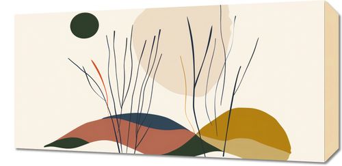 Obraz z serii boho zatytułowany Szept Wiatrów. Grafika przedstawia abstrakcyjny pejzaż, w którym finezyjne, czarne linie wyobrażają łagodnie kołyszące się trawy. Kształty w ciepłych odcieniach ziemi tworzą iluzję wzgórz i ścieżek, a dyskretna zielona kropka w górnym rogu zdaje się być echem oddalającego się słońca lub zapowiedzią zmierzchu. Wszystko to ujęte na tle delikatnego beżu, co nadaje dziełu spokojny, relaksujący nastrój. Obraz ten idealnie wpasuje się w wnętrza, które aspirują do wyciszenia i harmonii z naturą, jak przytulne salony, jadalnie, czy miejsca przeznaczone do medytacji. Może być również pięknym, uspokajającym dodatkiem do biur, bibliotek czy innych przestrzeni wymagających skupienia i spokoju.