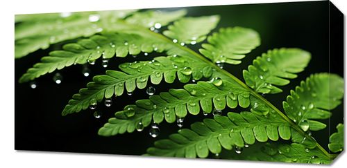 Obraz z serii natura zatytułowany Szepty Natury, prezentuje zbliżenie na liść paproci okryty kropelkami rosy, które lśnią jak drogocenne klejnoty na jego witalnie zielonej powierzchni. Delikatność każdej kropli wody, zawieszonej jakby na skraju czasu, oddaje spokój i harmonię natury, jednocześnie przywołując uczucie świeżości i ożywienia. Tło obrazu jest głębokie i jednolite, co pozwala zaakcentować jasne zieleń liści i przezroczystość wody. Ten obraz może być symbolem czystości i nowych początków, idealnie wkomponuje się w przestrzenie skoncentrowane na zdrowiu i dobrostanie, takie jak gabinety lekarskie, spa, czy też jako element dekoracyjny w łazienkach i pomieszczeniach relaksacyjnych, przynosząc uczucie spokoju i odświeżenia.