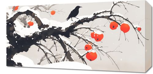 Obraz z serii motywy wschodnie zatytułowany Wschodnia Akwarela przedstawia zimowy krajobraz w stylu wschodnim. Drzewo o ciemnych, wyrazistych gałęziach pokrytych śniegiem wygina się elegancko na tle spokojnego, jednolitego tła. Na gałęziach znajdują się czerwone owoce, które mogą być symbolem persymonów lub innych zimowych owoców, kontrastujących swoim żywym kolorem z zimowym otoczeniem. Na jednej z gałęzi spoczywa czarny ptak, być może kruk, co dodaje życia i głębi kompozycji. Spadające płatki śniegu i subtelne odcienie w tle nadają scenie uczucie spokoju i ciszy. Ten obraz łączy prostotę z elegancją, mogąc stanowić wyrafinowaną dekorację w przestrzeniach szukających spokojnej, lecz wyrazistej estetyki.