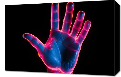 Obraz z serii pop art zatytułowany Dotyk Przyszłości. Ta hipnotyzująca grafika przedstawia ludzką dłoń w stylizacji przypominającej obrazy z tomografii komputerowej, z neonowymi konturami podkreślającymi linie i krzywizny dłoni. Żywe odcienie błękitu i różu przecinają się, tworząc dynamiczny, ale harmonijny kontrast na ciemnym tle. Ten obraz oddaje piękno ludzkiej anatomii poprzez futurystyczną estetykę, zachęcając do refleksji nad połączeniem sztuki, nauki i technologii. Idealny dla nowoczesnych przestrzeni, gdzie innowacja i design idą w parze.
