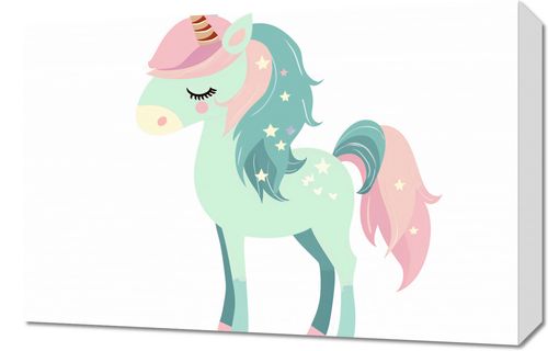 Obraz z serii wnętrza zatytułowany Jednorożec Marzeń. Na tej zachwycającej ilustracji przedstawiono pastelowego jednorożca, którego turkusowe ciało pokryte jest subtelnymi gwiazdkami, a jego miękka, różowa grzywa delikatnie opada. Zamknięte oczy i łagodny uśmiech dodają uroku tej mitycznej istocie, wprowadzając element spokoju i radości. Obraz idealnie nadaje się do pokoju dziecięcego lub innej przestrzeni przeznaczonej dla dzieci, tworząc atmosferę bajkowej krainy pełnej czarów i cudów. Delikatne kolory i uroczy wzór są doskonałe, aby rozbudzić wyobraźnię i dodać uroku każdemu wnętrzu, zachęcając do marzeń i optymizmu.
