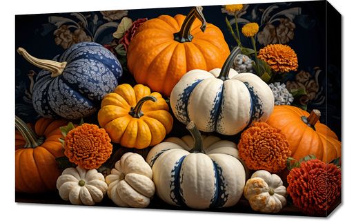 Obraz z serii natura zatytułowany Jesienne Bogactwo. Ta kompozycja to celebracja urodzaju jesieni, ukazująca bogactwo i różnorodność dyń w pełnej krasie. Kontrastujące faktury i kolory od kremowej bieli do głębokiej pomarańczy są uzupełnione o ciepłe odcienie złotych kwiatów, tworząc obraz, który emanuje ciepłem i domową atmosferą. Idealny do dekoracji kuchni lub jadalni, gdzie może inspirować do sezonowych przetworów i przygotowań świątecznych potraw. Ten obraz będzie również doskonałym dodatkiem do przestrzeni takich jak sklepy z dekoracjami domowymi, kawiarnie lub restauracje, które chcą wprowadzić atmosferę przytulności i naturalnego piękna.