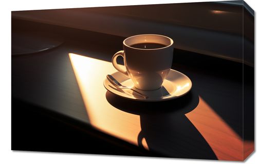 Obraz z serii wnętrza zatytułowany Kawa o Poranku. Na obrazie widzimy klasyczny biały porcelanowy kubek z parującą kawą, który jest oświetlony złocistym światłem wschodzącego słońca, tworząc malownicze cienie i błyski na stoliku. Ciepła i spokojna kompozycja tego obrazu przynosi uczucie relaksu i chwili wytchnienia, idealnie oddając poranny rytuał picia pierwszej kawy. Obraz ten wprowadzi element elegancji i spokoju do każdego wnętrza, zwłaszcza polecamy go do przestrzeni, gdzie chcemy podkreślić ważność chwil odpoczynku i refleksji, takich jak kawiarnie, restauracje, a także domowe kuchnie lub jadalnie.