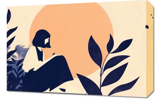 Obraz z serii minimalistyczne zatytułowany Kontemplacja. Ta delikatna grafika przedstawia sylwetkę kobiety w stanie kontemplacji na tle dużego, ciepłego, pomarańczowego słońca. Sylwetka jest otoczona przez proste, ale eleganckie czarne rośliny, co dodaje kompozycji spokojnego nastroju.Ten obraz jest idealny dla przestrzeni, które pragną wprowadzić momenty spokoju i refleksji. Będzie wspaniałym dodatkiem do sypialni, czytelni, kącików medytacyjnych czy nawet przestrzeni terapeutycznych.