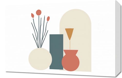 Obraz z serii boho zatytułowany Kremowe Wazony. Obraz to gra geometrycznych kształtów i łagodnych, pastelowych kolorów tworzących spokojną, ale interesującą kompozycję. Na pierwszym planie mamy delikatne, cienkie linie roślin z okrągłymi płatkami, które kontrastują z solidnymi blokami kolorów - kremowym, łososiowym i głębokim morskim. Tło tworzy architektoniczna forma w kształcie łuku, nadając obrazowi poczucie głębi i struktury. Grafika emanuje równowagą i prostotą, idealnie pasując do wnętrz w stylu skandynawskim, biur lub przestrzeni mieszkalnych, gdzie chcemy dodać odrobinę ciepła bez przytłaczania przestrzeni.