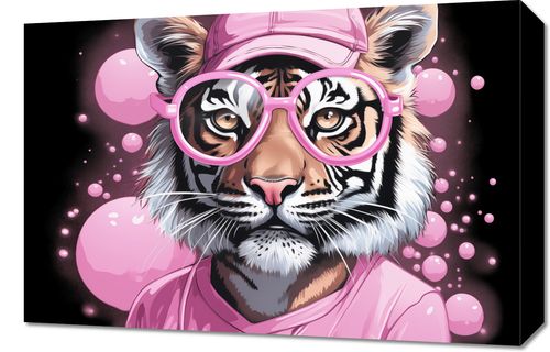 Obraz z serii pop art Ludzki Tygrys. Na obrazie widzimy głowę tygrysa, który jest ubrany w stylizowany, ludzki sposób. Tygrys ma na sobie różową czapkę z daszkiem oraz okulary w tym samym kolorze, co dodaje mu ludzkiego charakteru. Tło obrazu jest proste, pokryte bąbelkami w różnych odcieniach różu, co tworzy zabawny i lekko surrealistyczny klimat. Ten kolorowy i kreatywny projekt może przyciągnąć uwagę w różnorodnych przestrzeniach, od młodzieżowych pokoi po galerie sztuki. Jest to doskonały przykład współczesnego połączenia natury i kultury pop, który może być tematem rozmów i oryginalnym elementem dekoracyjnym.