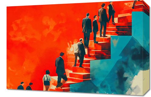 Obraz z serii abstrakcja zatytułowany Metafory Sukcesu. Przedstawia on różne postacie w formalnym ubiorze, wchodzące i schodzące po schodach, które rozdzielają się i zbiegają w różnych kierunkach. Tło obrazu jest podzielone na dwie kontrastujące strony - jedna w odcieniach czerwieni, a druga w chłodnych błękitach, symbolizując różne ścieżki i wybory w życiu zawodowym lub osobistym. Styl graficzny łączy elementy abstrakcyjne i figuralne, a silne kontrasty kolorystyczne podkreślają dynamikę i złożoność podejmowanych decyzji. Obraz ten mógłby być inspirującym dodatkiem do biura lub przestrzeni pracy, zachęcającym do refleksji nad własnym rozwojem i aspiracjami.