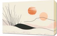 Obraz z serii boho zatytułowany Miękkie Wzgórze. Przedstawia on poetycką interpretację zachodzącego słońca, gdzie delikatne linie roślin wyłaniają się z miękkich, falujących wzgórz. Paleta kolorów to ciepłe odcienie beżu, różu oraz akcenty silniejszego pomarańczu i głębokiej czerni, które razem tworzą kojącą i spokojną atmosferę. Abstrakcyjne słońca o różnych odcieniach i wielkościach dodają kompozycji głębi i perspektywy. Ten obraz doskonale sprawdzi się jako akcent dekoracyjny w przestrzeniach, które mają być miejscem relaksu i odprężenia. Jego spokojna kolorystyka i delikatne linie będą komplementować wnętrza takie jak sypialnie, pokoje medytacyjne, gabinety relaksacyjne lub każde miejsce, które chce celebrować spokój i cichą elegancję.