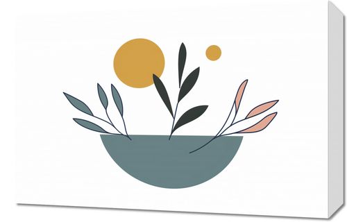 Obraz z serii boho zatytułowany Miska Roślinności.Obraz ukazuje symetryczną kompozycję roślinnych motywów w prostych, czystych formach. Geometryczne kształty w spokojnej palecie kolorów harmonijnie współgrają z naturalistycznymi akcentami roślinnymi. Złote i żółte kręgi mogą symbolizować słońce, które ożywia i rozjaśnia scenę. Dzieło to wprowadza do przestrzeni elementy natury w uporządkowany, niemal medytacyjny sposób. Idealnie nadaje się do wnętrz, które aspirują do spokoju i równowagi, od nowoczesnych salonów po ciche kąciki do czytania lub relaksu. Zapewnia przytulność i jednocześnie zachowuje czystość i prostotę estetyczną.