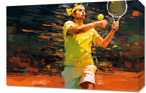 Obraz z serii abstrakcja zatytułowany Mistrzowski Serwis. Na tym żywiołowym dziele sztuki widzimy sylwetkę tenisisty w pełnym ruchu, wykonującego potężny serwis. Stylizacja obrazu przypomina impresjonistyczne pociągnięcia pędzla z żywymi plamami farby, które tworzą dynamiczny, prawie abstrakcyjny obraz akcji na korcie tenisowym. Barwy, od ciepłych żółci i pomarańczy do intensywnych cieni, podkreślają energię i pasję sportowej rywalizacji. To dzieło sztuki oddaje siłę, skupienie i elegancję tenisowej gry, będąc idealnym akcentem dla przestrzeni sportowych oraz dla miłośników i entuzjastów tenisa.