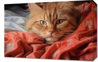Obraz z serii wnętrza zatytułowany Mruczący Spokój. Na obrazie widnieje portret majestatycznego, rudo-pomarańczowego kota, który, otulony czerwonym materiałem, spogląda spokojnie i wnikliwie, przyciągając uwagę swoimi głębokimi, niebieskimi oczami. Kontrast między miękkim futrem a żywym kolorem tkaniny tworzy ciepłą i kojącą atmosferę. Obraz ten będzie idealnym akcentem dla każdego wnętrza, gdzie chcemy dodać odrobinę domowego ciepła i spokoju, a szczególnie polecany jest do salonu czy sypialni. Może być również pięknym elementem dekoracyjnym w weterynarii lub sklepie zoologicznym, podkreślając miłość i troskę o naszych czworonożnych przyjaciół.