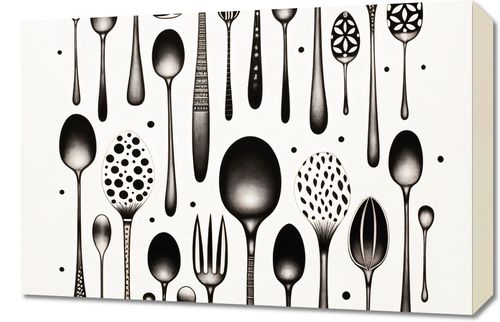 Obraz z serii wnętrza zatytułowany Narzędzia Smaku. Eleganckie sylwetki sztućców w różnorodnych kształtach i wzorach, podkreślane przez subtelne detale i geometryczne punkty, tworzą harmonijną i równocześnie zaskakującą kompozycję. Czarne i białe tony nadają prostotę i wyrafinowanie, podczas gdy unikalne projekty sztućców dodają nuty kreatywności i innowacji. Idealnie sprawdzi się w nowoczesnych kuchniach, restauracjach o minimalistycznym designie oraz w przestrzeniach dedykowanych sztuce kulinarnej.