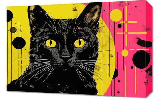 Obraz z serii pop art zatytułowany Neonowy Kocur - odważne połączenie klasycznego portretu kota z awangardowymi elementami graficznymi. Czarny kontur kota na intensywnym żółtym i różowym tle przyciąga wzrok i wzbudza zainteresowanie. Żółte oczy kota są jak punkty skupienia, które przykuwają uwagę i dodają charakteru dziełu. Abstrakcyjne formy i plamy koloru w tle wprowadzają dynamiczność i nowoczesny charakter, idealnie pasując do współczesnych przestrzeni mieszkalnych i komercyjnych. Ten obraz będzie doskonałym wyborem dla miłośników sztuki, którzy pragną dodać odrobinę kreatywności i koloru do swojego wnętrza.