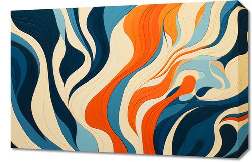 Obraz z serii abstrakcja zatytułowany Oceaniczne Fale. Hipnotyzujący wir barw przypominający przemieszczające się fale oceanu, w których błękit miesza się z głęboką granatową otchłanią i akcentami ciepłego, płonącego ognia. Te złożone wzory płynnie przechodzą w jedną całość, tworząc wizualny spektakl, który zaprasza do głębokiej kontemplacji. Kontrastujące kolorowe pasma dodają obrazowi dynamiki i witalności. Doskonale sprawdzi się w nowoczesnych biurach o minimalistycznym wnętrzu oraz w przestrzeniach publicznych, takich jak galerie sztuki czy kawiarnie o awangardowym designie.