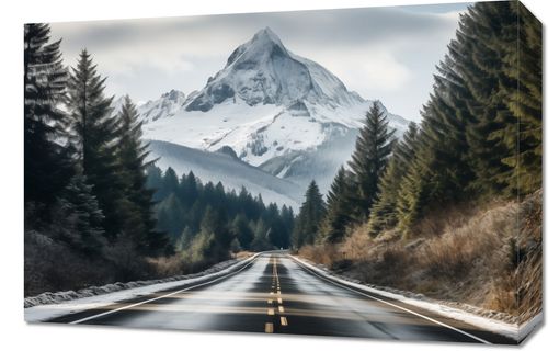 Obraz z serii pejzaże zatytułowany Odważna Podróż, przedstawia majestatyczną górę wyłaniającą się z pośród ciemnozielonych drzew iglastych, które wyznaczają drogę prowadzącą w kierunku jej śnieżnego szczytu. Siła i niezachwiana postawa góry w połączeniu z miękkimi konturami puchowych chmur nad nią tworzą doskonałą równowagę między wytrwałością a delikatnością. Czarna, wilgotna nawierzchnia drogi, rozświetlona światłem odbijającym się od jej wilgotnej powierzchni, prowadzi wzrok obserwatora wprost do serca dzikiej przyrody. Kontrast między ciemnymi drzewami a bielą śniegu dodaje dziełu głębi i tajemniczości. Ten obraz będzie idealnym dodatkiem do wnętrz o tematyce przygodowej i eksploracyjnej, jak również doskonałym wyborem dla przestrzeni biurowych firm turystycznych lub agencji podróżniczych, gdzie może inspirować i przypominać o majestacie i pięknie niezbadanych zakątków świata.