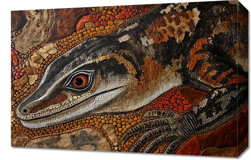 Obraz z serii abstrakcja zatytułowany Oko Jaszczurki. Fascynujące dzieło sztuki przedstawia zbliżenie na oko jaszczurki, które jest wykonane z niezwykłą dbałością o detale. Bogata faktura skóry zwierzęcia oraz użycie techniki przypominającej pointylizm sprawiają, że obraz zyskuje trójwymiarową głębię i realizm. Dynamiczna paleta barw, od głębokich odcieni brązu po złote i pomarańczowe akcenty, podkreśla dziką i pierwotną esencję natury. Obraz ten idealnie wpasuje się w dekoracje wnętrz o tematyce przyrodniczej, jak również stanowić może wyrazisty element w przestrzeniach edukacyjnych, takich jak sale biologiczne czy przyrodnicze, a także jako elegancki akcent w przestrzeniach mieszkalnych dla miłośników natury i dzikiej fauny.