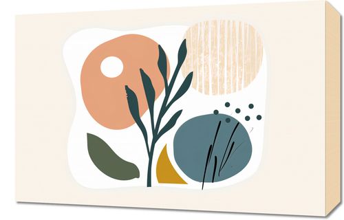 Obraz z serii boho zatytułowany Pastel Owoców.Obraz przedstawia stilizowany obraz natury, gdzie organiczne formy i kształty łączą się w nieoczywisty sposób. W kompozycji dominuje duża, pastelowa forma przypominająca owoce lub słońce, która kontrastuje z subtelnym tłem w delikatnych odcieniach beżu ozdobionym wertykalnymi liniami. Obok widnieją płynne, ciemnozielone liście oraz zaokrąglone, geometryczne formy w odcieniach szarości i musztardy, uzupełnione o subtelne graficzne akcenty. Obraz będzie pięknie komponował się w przestrzeniach poszukujących elementów natury w abstrakcyjnej, uproszczonej formie, idealnie nadając się do nowoczesnych salonów, kreatywnych przestrzeni pracy lub jako delikatny akcent w minimalistycznej sypialni.