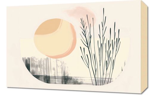 Obraz z serii boho zatytułowany Pastelowy Wschód. Obraz ukazuje subtelny, linearny rysunek roślinności na tle dużego, pastelowego słońca i delikatnie zaznaczonych elementów krajobrazu. Kompozycja w pastelowych, ciepłych barwach tworzy wrażenie spokojnego wschodu słońca, który rozświetla delikatne kontury roślin i miękkie formy w tle. Obraz ten idealnie wpasuje się do wnętrz o stonowanej kolorystyce, gdzie może dodać odrobinę ciepła i subtelnego charakteru. Doskonale nadaje się do sypialni, salonów, czy innych miejsc odpoczynku, gdzie wprowadzi łagodny nastrój i poczucie wyciszenia.