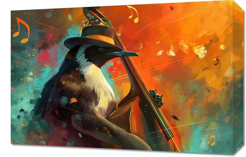 Obraz z serii abstrakcja zatytułowany Pingwinia Nuta. Przedstawia figurę pingwiniego muzyka, elegancko ubranego, grającego na kontrabasie. Ptak nosi klasyczny kapelusz, który dodaje mu artystycznego charakteru, a jego pióra delikatnie przechodzą w struny instrumentu, co tworzy efekt płynnego połączenia muzyki z naturą. Tło obrazu rozświetlone jest ciepłymi, żywymi barwami oraz abstrakcyjnymi kształtami, które przypominają rozsypane nuty i dynamiczny ruch jazzowej melodii. Ten obraz idealnie nada się do wnętrz o muzycznym duszu, takich jak sale koncertowe, studia nagraniowe, jazzowe kluby lub nawet domowe przestrzenie dla miłośników muzyki. Wizualizuje on pasję do muzyki i jej wpływ na otaczającą nas przestrzeń, jednocześnie wprowadzając element wyrafinowanego stylu.