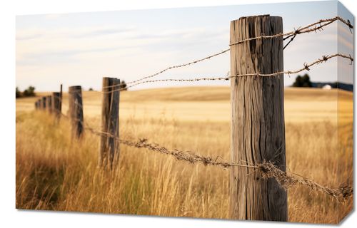 Obraz z serii pejzaże zatytułowany Płot na Polu. Obraz przedstawia rustykalny drewniany płot z drutem kolczastym, ciągnący się wzdłuż złocistego, zbożowego pola. Delikatne odcienie złota i brązu, w połączeniu z subtelnie rozmytym tłem, tworzą poczucie głębi i przestrzeni. Ten spokojny, wiejski krajobraz wprowadza atmosferę relaksu i odprężenia, idealnie nadając się do wnętrz inspirowanych naturą lub jako ukojenie dla zaganianych mieszkańców miast. Doskonały do salonu, jadalni lub jako element wypoczynkowej przestrzeni.