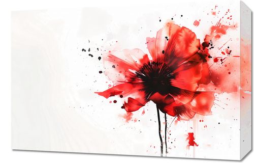 Obraz z serii abstrakcja zatytułowany Płynna Akwarela. Na obrazie przedstawiony jest kwiat w stylu akwarelowym, z dominującą czerwoną paletą barw, która przechodzi w mocne akcenty czerni w centrum kwiatu. Obraz ma dynamiczny i spontaniczny charakter, co podkreślają rozbryzgi i krople farby rozchodzące się wokół kwiatu. Przypomina to efekt plamy, który dodaje kompozycji artystycznego wyrazu i energii. Kontrast między delikatnymi czerwieniami a głęboką czerń centrum kwiatu przyciąga wzrok i czyni obraz bardzo wyrazistym. Tło jest jasne z subtelnie zaznaczonymi plamami, co dodatkowo akcentuje dramatyzm i piękno przedstawionego kwiatu.