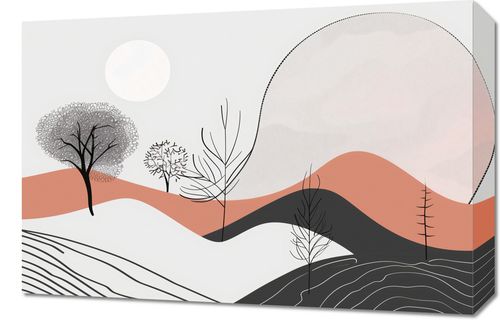 Obraz z serii boho zatytułowany Półcień Widoku.Obraz przedstawia oniryczny pejzaż, gdzie delikatne linie drzew przenikają przez łagodne, faliste wzgórza. Ciepłe odcienie czerwieni i różu przeplatają się z chłodniejszymi szarościami i czernią, tworząc poczucie głębi i spokoju. Subtelna tekstura na niektórych elementach dodaje wrażenia ruchu, a biała sfera w tle przywołuje skojarzenia z pełnią księżyca lub wschodzącym słońcem. Dzieło idealnie wpasuje się w wnętrza o spokojnym charakterze, takie jak stylowe sypialnie, czytelnie lub pokoje relaksacyjne. Może również przynieść element ukojenia i inspiracji do przestrzeni współpracujących, zapewniając wizualną odskocznię od codzienności. Zapewni miękki kontrast we wnętrzach urządzonych w naturalnych materiałach i odcieniach.