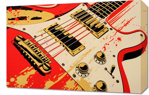 Obraz z serii abstrakcja zatytułowany Przed Graniem. Przedstawia zbliżenie na czerwoną gitarę elektryczną, której design jest wyrazisty i pełen energii. Widać detale instrumentu, takie jak przetworniki, potencjometry i struny, które są wyraźnie zaznaczone kontrastującymi kolorami złota, czerni i bieli na tle intensywnej czerwieni. Rozpryski i plamy farby na korpusie gitary nadają plakatowi surowy, rockowy charakter, co może sugerować żywiołowość i pasję muzyki granej na tym instrumencie. Ten obraz mógłby być atrakcyjnym elementem dekoracyjnym w przestrzeniach dedykowanych muzyce, takich jak sale prób, studia nagraniowe, pokoje młodzieżowe lub jako odważny akcent w nowoczesnym salonie.