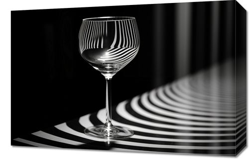 Obraz z serii wnętrza zatytułowany Refleksje nad Szkłem. Ten artystyczny obraz przedstawia krystalicznie czystą kieliszkę do wina, której kontury i zawartość są zniekształcone przez interesujący wzór światła i cienia. Geometryczne linie tworzące symetryczny wzór na tle i podłożu, dają iluzję ruchu i głębi. Ten obraz to wyrafinowana dekoracja, idealna dla nowoczesnych przestrzeni mieszkalnych, barów, lub jako elegancki akcent w restauracji. Zapewnia minimalistyczne, lecz wyraziste akcenty w każdej aranżacji wnętrza.