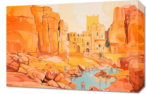 Obraz z serii abstrakcja zatytułowany Ruiny pod Słońcem. Ta ilustracja przedstawia scenę z antycznymi ruinami w ciepłej, pastelowej palecie kolorów, która oddaje odczucie spiekoty i światła słonecznego. Zarysy starożytnej architektury wyrastają z pustynnego krajobrazu, nadając scenerii poczucie wieczności i historii. Odbicie wody i subtelne sylwetki postaci w tle wprowadzają ludzki wymiar do tej scenerii, sugerując trwającą obecność i ciągłość cywilizacji. Obraz ten idealnie wprowadzi do każdego wnętrza element przygody i odkryć, inspirowany podróżami i historią, idealny dla przestrzeni publicznych, biur podróży, a także jako dekoracja w domach miłośników historii.