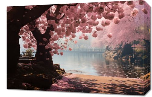 Obraz z serii motywy wschodnie zatytułowany Spokój Sakury przenosi nas do spokojnego zakątka, gdzie rozkwitłe drzewa wiśni tworzą bajkowy baldachim nad lśniącym jeziorem. Subtelna gra światła i cienia na delikatnych różowych płatkach w połączeniu z łagodnym odbiciem wody tworzy atmosferę spokoju i kontemplacji. Ta scena jest synonimem wiosennej odnowy i piękna, która z łatwością wniesie element romantycznej natury do każdego wnętrza. Idealnie odnajdzie się w przestrzeniach wypoczynkowych, pokojach gościnnych, czy salonach spa, dodając im uroku i subtelnej elegancji.