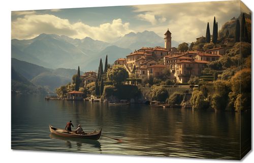 Obraz z serii pejzaże zatytułowany Spokojna Nostalgia, ten urzekający pejzaż przenosi nas do sielankowej wioski nad jeziorem, gdzie czas zdaje się płynąć wolniej. Łagodne światło rozlewające się nad architekturą wioski i gładką powierzchnią wody tworzy poczucie ciepła i spokoju. Para przemieszczająca się łodzią dodaje element ludzki, harmonijnie wpisując się w krajobraz. To dzieło sztuki idealnie nadaje się do przestrzeni, które mają na celu wprowadzenie atmosfery spokoju i refleksji, takich jak biblioteki, poczekalnie lub prywatne gabinety, zapewniając odprężającą ucieczkę od codziennego zgiełku.