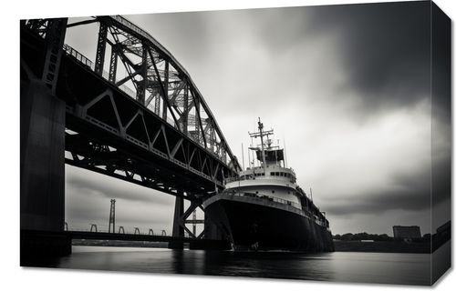 Obraz z serii pejzaże zatytułowany Statek przy Moście. Monochromatyczne przedstawienie statku pod imponującym mostem, gdzie struktury inżynieryjne łączą się z dynamicznym niebem, tworząc kompozycję symbolizującą siłę i postęp. Chłodna paleta barw i silne linie prowadzące oko przez obraz idealnie nadają się do nowoczesnych przestrzeni biurowych lub urbanistycznych salonów. Obraz ten przyciąga uwagę i inspiruje, odzwierciedlając majestat i piękno konstrukcji stworzonych przez człowieka.