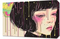 Obraz z serii pop art zatytułowany Strugi Kolorów. Ten hipnotyzujący obraz przedstawia wizerunek młodej kobiety z przymkniętymi oczami, jej twarz zdaje się być na granicy snu i jawy. Nad nią i wokół niej płyną strugi kolorów, które wydają się rozlewać jak ciecz, tworząc atmosferę oniryczną i abstrakcyjną. Kontrast między realistyczną twarzą a surrealistycznym tłem podkreśla emocjonalną głębię i złożoność ludzkich doświadczeń.Obraz ten doskonale uzupełni przestrzeń pełną kreatywności i wyobraźni, taką jak pracownie artystyczne, kawiarnie, czy nawet nowoczesne pokoje młodzieżowe. Może również stanowić niebanalny akcent w pomieszczeniach terapeutycznych lub coachingowych, gdzie rozmowa na temat emocji i wewnętrznego świata jest na porządku dziennym.
