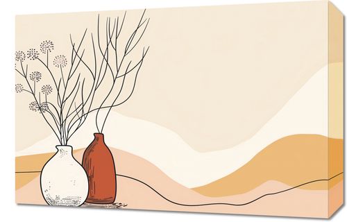 Obraz z serii minimalistyczne zatytułowany Stylowe Beże. Obraz przedstawia uproszczoną, elegancką kompozycję waz z suszonymi roślinami na tle delikatnych, pustynnych wzgórz. Wazony o prostych formach i kontrastowych kolorach - jeden biały, drugi w odcieniu ciepłej cegły - stoją przed zmiennym tłem beżów i brązów. Rośliny zostały przedstawione za pomocą czarnych, finezyjnych linii, które dają iluzję delikatności i subtelności. Obraz z łatwością wpasuje się w różne wnętrza dzięki swojej neutralnej palecie kolorów i prostocie form. Będzie doskonałym wyborem do pomieszczeń urządzonych w stylu skandynawskim, boho, a także w nowoczesnych przestrzeniach biurowych. Zapewnia ciepło i wyrafinowanie, a jednocześnie nie przytłacza przestrzeni.