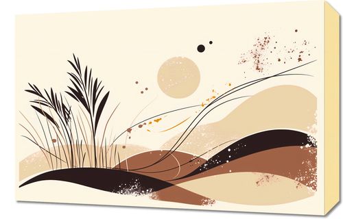 Obraz z serii minimalistycznej zatytułowany Szept Gwizdu. Widać na nim stylizowaną kompozycję z trawami i kształtami, które mogą przywoływać na myśl górskie krajobrazy. Barwy są ciepłe i naturalne, z dominującymi beżami, brązami oraz akcentami w kolorze terakoty.Ten plakat doskonale uzupełni wnętrza w stylu boho, skandynawskim, jak również te o bardziej rustykalnym czy naturalnym charakterze. Jego spokojna paleta kolorów i subtelna grafika sprawią, że będzie idealnym dodatkiem do sypialni lub salonu, wprowadzając atmosferę relaksu i spokoju.