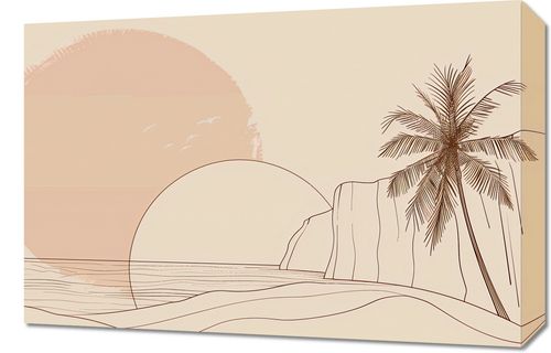 Obraz z serii minimalistyczne zatytułowany Szept Tropików. Plakat przedstawia delikatnie zarysowany krajobraz tropikalny o wschodzie lub zachodzie słońca. W centralnej części kompozycji widnieje wielki, ciepły dysk słońca, którego połowa chowa się za horyzontem. U jego podstawy majaczą delikatne linie morza, a na pierwszym planie z prawej strony wznosi się smukła palma o finezyjnie narysowanych liściach. Z lewej strony rysunek przedstawia wysokie klify, które wyłaniają się z morza, a na tle słońca można dostrzec lekkie sylwetki ptaków. Ten plakat to kwintesencja spokoju i harmonii, świetnie sprawdzi się w pomieszczeniach, które mają być oazą relaksu, takich jak salon, sypialnia czy pokój do medytacji. Jego ciepłe, pastelowe barwy i proste linie mogą również dodać elegancji i spokoju do przestrzeni biurowych, wspomagając skupienie i kreatywne myślenie.
