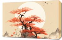 Obraz z serii pejzaże zatytułowany Szepty Wiatru. Niesamowity krajobraz z jaskrawo czerwonymi drzewami rosnącymi na majestatycznej skale, której kształty wydają się być ukształtowane przez wieki. Błyszczący biały księżyc oświetla spokojne wody, które otaczają skale, podczas gdy stado ptaków przenika przez jasne niebo, dodając uczucie przestrzeni i nieskończoności. Subtelne odcienie szarości i biele w tle tworzą kontrast dla wyrazistych czerwieni drzew, nadając scenie głębię i dramatyzm. Idealny do ozdoby salonów medytacyjnych, gabinetów terapeutycznych lub luksusowych hotelowych holów.