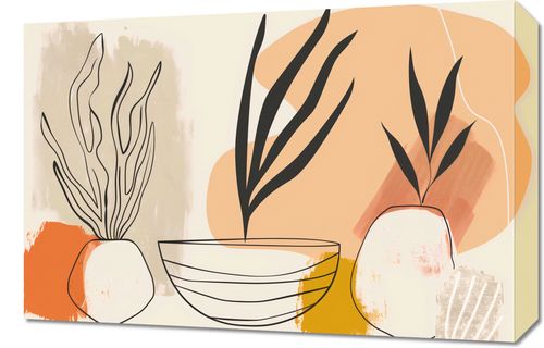 Obraz z serii boho zatytułowany Szkice Botaniczne. Na obrazie przedstawiono stylizowane rośliny o delikatnych, ale wyrazistych konturach w dwóch kontrastujących doniczkach, które stanowią centralny punkt kompozycji. Tło, składające się z abstrakcyjnych kształtów i pociągnięć pędzla w ciepłej palecie barw - od terrakoty do bladego koralu - zapewnia przyjemny kontrast dla czarnych linii roślin. Minimalistyczny charakter ilustracji, w połączeniu z organicznymi formami i neutralnymi barwami, sprawia, że jest to idealny element do wnętrz, które cenią prostotę i spokój, takich jak nowoczesne biura, jadalnie czy salony, gdzie może wprowadzić lekkość i świeżość wizualną.