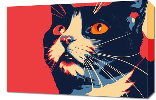 Obraz z serii abstrakcja zatytułowany Szok. Obraz przedstawia zbliżenie na twarz kota w stylizowanej, graficznej formie. Przeważającym kolorem jest intensywny czerwony, który stanowi tło dla sylwetki kota. Wyraziste, żółte oczy zwierzęcia przyciągają uwagę, a ich niemal hipnotyzujący wzrok jest skierowany ku widzowi. Wizerunek kota jest zróżnicowany kolorystycznie: od ciemnych odcieni, poprzez szarości, aż po żywe akcenty błękitu i pomarańczy, które dodają dynamiki i głębi. Detale takie jak wąsy i futro są wyraźnie zaznaczone białymi i niebieskimi liniami, co nadaje ilustracji ruch i teksturę. Całość kompozycji ma współczesny, prawie popartowy charakter, przyciągając wzrok i wzbudzając emocje. Jest to dzieło, które mogłoby znaleźć miejsce w nowoczesnych przestrzeniach, podkreślając miłość do zwierząt i sztuki.