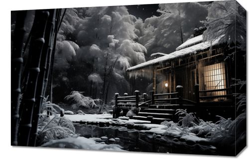 Obraz z serii motywy wschodnie zatytułowany Tradycyjna Japońska Chatka - urokliwy i spokojny obraz przedstawiający tradycyjną japońską chatę otuloną śniegiem, z delikatnym światłem emanującym z jej wnętrza. Scena rozgrywa się w głębi tajemniczego bambusowego lasu pod osnutej gwiazdami zimowej nocy. Obfite opady śniegu pokrywają każdą powierzchnię, tworząc miękki dywan, który tłumi dźwięki otoczenia, zachęcając do refleksji i wyciszenia. Delikatne światła dobiegające z chaty dodają ciepła i przytulności, kontrastując z chłodem niebiesko-szarych odcieni śniegu i nocy. Obraz ten wprowadzi do każdego wnętrza atmosferę spokoju i ukojenia, będąc doskonałym dodatkiem do przestrzeni takich jak salony, pokoje relaksacyjne, czy miejsca przeznaczone do medytacji.