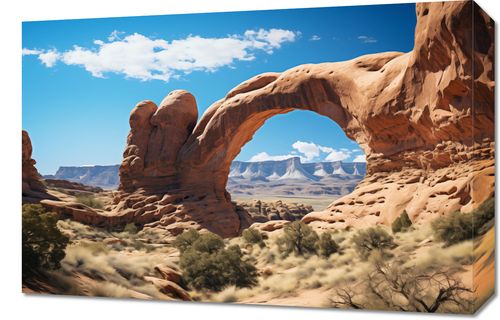 Obraz z serii pejzaże zatytułowany Triumf Natury. Zapierający dech w piersiach widok naturalnej formacji skalnej, która tworzy naturalny łuk, jest świadectwem niezwykłej siły i wytrwałości natury. Ciepłe odcienie pomarańczu i brązu skalnego łuku kontrastują z głębokim błękitem nieba, a delikatne zielone akcenty roślinności dodają życia i głębi kompozycji. Ta scena emanuje siłą i spokojem, stanowiąc doskonałe uzupełnienie dla przestrzeni takich jak współczesne biura, eleganckie pokoje dziennego wypoczynku, a także jako element dekoracyjny w hotelach i miejscach publicznych, gdzie natura spotyka się z designem.