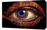 Obraz z serii abstrakcja zatytułowany W Oku Obserwatora. Ta złożona, surrealistyczna grafika przedstawia ludzkie oko, w którego tęczówce odzwierciedlone są bogate, abstrakcyjne i symboliczne wzory, przypominające fragmenty różnych dzieł sztuki. Barwne motywy w tęczówce mieszają się z intensywną czerwienią, żółcią i niebieskością, tworząc efekt kalejdoskopu kulturowych wpływów. Zadziwiająca szczegółowość pracy sugeruje głębię ludzkiego spojrzenia i różnorodność perspektyw, które możemy doświadczać poprzez sztukę. Obraz ten z pewnością zaintryguje i stanie się punktem centralnym każdej przestrzeni, szczególnie tam, gdzie sztuka i kreatywność są w cenie, jak studia artystyczne, galerie, czy nowoczesne salony.