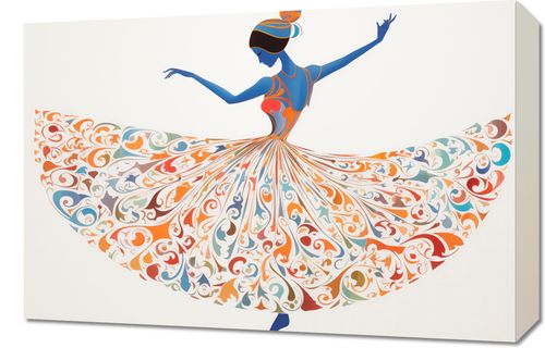 Obraz z serii abstrakcja zatytułowany Wirująca Balerina. Obraz przedstawia tancerkę w barwnym, rozłożystym stroju, który tworzy efekt wirującej sukni. Tancerka jest przedstawiona w dynamicznej pozie tanecznej, z rękami delikatnie uniesionymi. Suknia jest zdobiona bogatym, ornamentowym wzorem w ciepłych odcieniach pomarańczy, czerwieni, niebieskiego i kremu, które nadają jej lekkości i elegancji. Stylizacja postaci i wzory na sukni mogą nawiązywać do tradycyjnych strojów tanecznych lub folklorystycznych, a cała kompozycja przypomina sztukę w stylu Art Nouveau. Obraz ten wprowadza atmosferę radości i świętowania, doskonale nadając się do przestrzeni kulturalnych, sal tanecznych, teatrów lub jako wyrafinowana dekoracja w domowych wnętrzach.