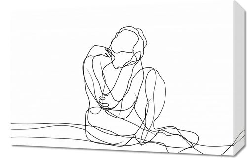 Obraz z serii wnętrza zatytułowany Zgarbienie. Obraz przedstawia minimalistyczny, jednoliniowy rysunek siedzącej postaci. Jest to przykład sztuki line art, gdzie cała forma jest zredukowana do jednej, ciągłej linii, która tworzy zarówno zewnętrzny kontur postaci, jak i wewnętrzne detale ciała i ubioru. Postać wydaje się zatopiona w myślach, z głową opartą na dłoni, co sugeruje introspekcję lub głębokie zamyślenie. Prosta elegancja tej pracy polega na jej zdolności do przekazywania emocji i postawy bez nadmiernego skomplikowania formy. Czyste tło podkreśla subtelność i skupienie kompozycji. Taki obraz może idealnie wpasować się w nowoczesne, ascetyczne wnętrza, gdzie może stanowić spokojny, ale wyrazisty akcent artystyczny.