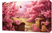 Obraz z serii natura zatytułowany Życie w Ulach – czarująca ilustracja, która celebruje obfitość i żywotność wiosny. Kompozycja przedstawia scenę z pszczółami żerującymi wśród bujnych, różowych kwiatów kwitnących drzew, co jest symbolem odradzającego się życia i płodności. Scena jest zanurzona w ciepłej, promiennej poświacie, która rozświetla drogę wiodącą przez kwiecisty krajobraz. Ule umieszczone wśród kwiatów podkreślają harmonijną współpracę między naturą a pracowitymi pszczołami. Ten obraz jest idealny do wnętrz, które pragną wprowadzić elementy natury, radości i wiosennej świeżości, doskonały do salonów, pokoi dziecinnych, a także jako inspirujący akcent w przestrzeniach edukacyjnych.