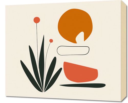Obraz z serii boho zatytułowany Abstrakcyjny Zen. Kompozycja obrazu łączy prostotę z abstrakcją, przedstawiając zestaw harmonijnie zbalansowanych kształtów i form. Wyraźne, ciemnozielone liście tworzą bazę dla kompozycji, z której wyrastają dwa okrągłe kwiaty na cienkich łodygach. Ich delikatność jest dodatkowo podkreślona przez dużą, okrągłą formę w ciepłym pomarańczu i spokojny, kremowy tło. Obraz sprawia wrażenie spokojnego i medytacyjnego, co sprawia, że jest idealny do miejsc przeznaczonych na wyciszenie i relaks, takich jak jasne, przestronne salony, pokoje do medytacji czy minimalistyczne sypialnie.
