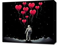 Obraz z serii pop art zatytułowany Astronauta Własnych Celi. Obraz przedstawia astronautę na powierzchni księżycowej, unoszącego się w przestrzeni kosmicznej dzięki bukietowi czerwonych balonów w kształcie serc. Scena łączy elementy romantyzmu z eksploracją kosmiczną, tworząc niezwykły kontrast między chłodną, ciemną przestrzenią kosmosu a ciepłymi emocjami symbolizowanymi przez serca. Tło jest proste, z błyszczącymi gwiazdami rozrzuconymi na nocnym niebie, co podkreśla izolację i spokój przestrzeni kosmicznej. Ten obraz może symbolizować miłość wykraczającą poza granice Ziemi, nieskończoną tęsknotę lub połączenie nauki z emocjami. Byłby idealnym prezentem dla kogoś wyjątkowego, szczególnie jeśli ta osoba interesuje się astronomią lub podróżami w kosmos.